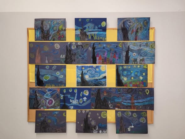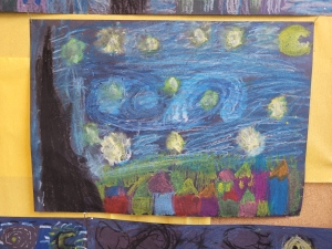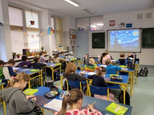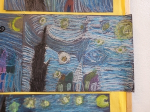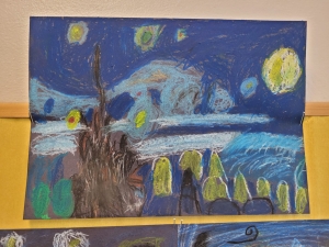 Tym razem klasa tworzyła prace inspirowane „Gwiaździstą nocą” van Gogha. W tym miesiącu uczniowie dowiedzieli się sporo o życiu artysty, jego twórczości oraz o impresjonizmie i ekspresjonizmie. Podczas poznawania historii Vincenta to fragmenty jego listów pisanych do brata Theo najpełniej pokazały im, jak głęboko van Gogh przeżywał sztukę i ile emocji w niej zostawiał.