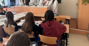 Uczniowie klas siódmych w trakcie lekcji fizyki potwierdzają cząsteczkową budowę materii